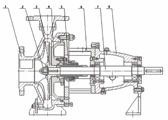 (1)泵(bèng)體;(2)葉輪(lun)螺母;(3)葉(yè)輪件;(4)泵(beng)蓋;(5)密封(fēng)部件;(6)中(zhōng)間支架(jià);(7)軸;(8)懸架(jià)部件
